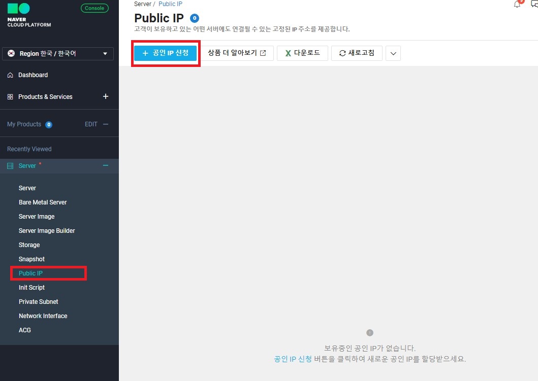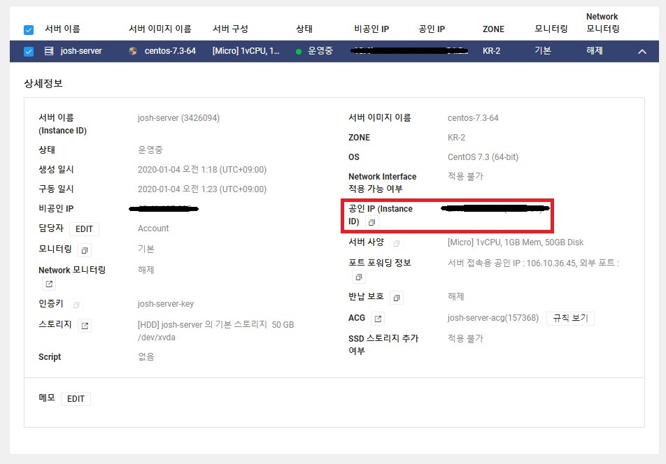 서버 메뉴로가서 상세보기를하면 공인IP가 적용된 모습을 볼 수있다.