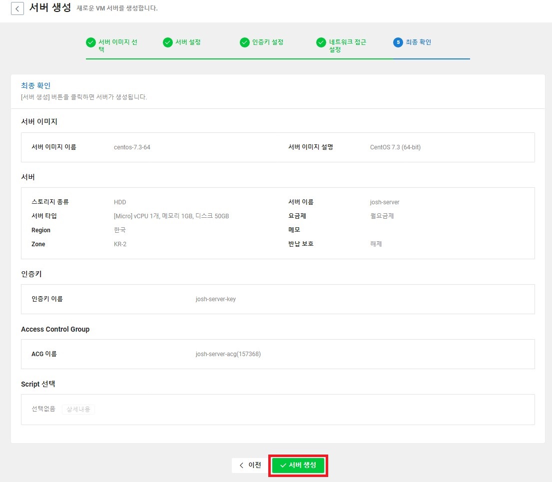 내가 설정한 정보를 확인 후 서버를 생성 한다.