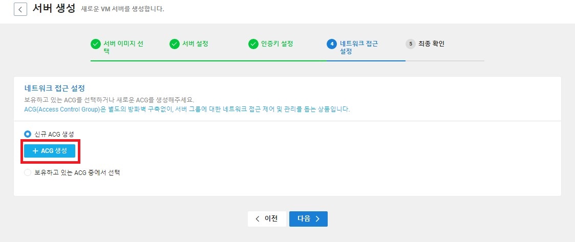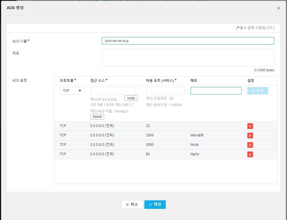 신규 ACG생성을 클릭하면 'ACG생성' 팝업창이 나오는데 아래와 같이 입력 한다.