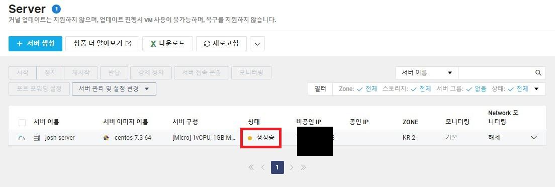 josh-server 이름의 서버가 생성된 모습이다. 상태 부분이 생성중 > 부팅중 > 설정중 > 운영중 으로 진행되며 최종적으로 '운영중' 이 되면 서버 생성이 완료된다. (Micro 서버라 그런지 굉장히 천천히 진행된다...)