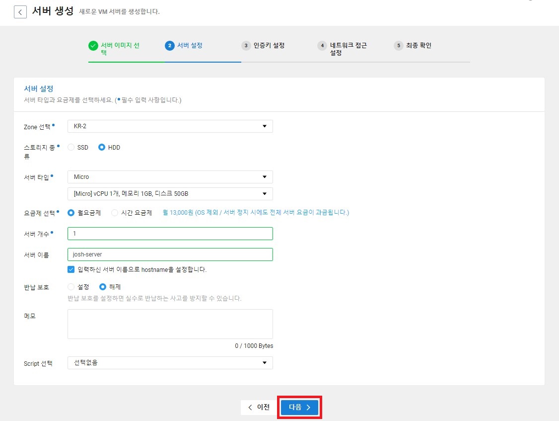 적용 서버를 방금 생성한 josh-server로 선택한 뒤 다음 버튼을 누른다.
