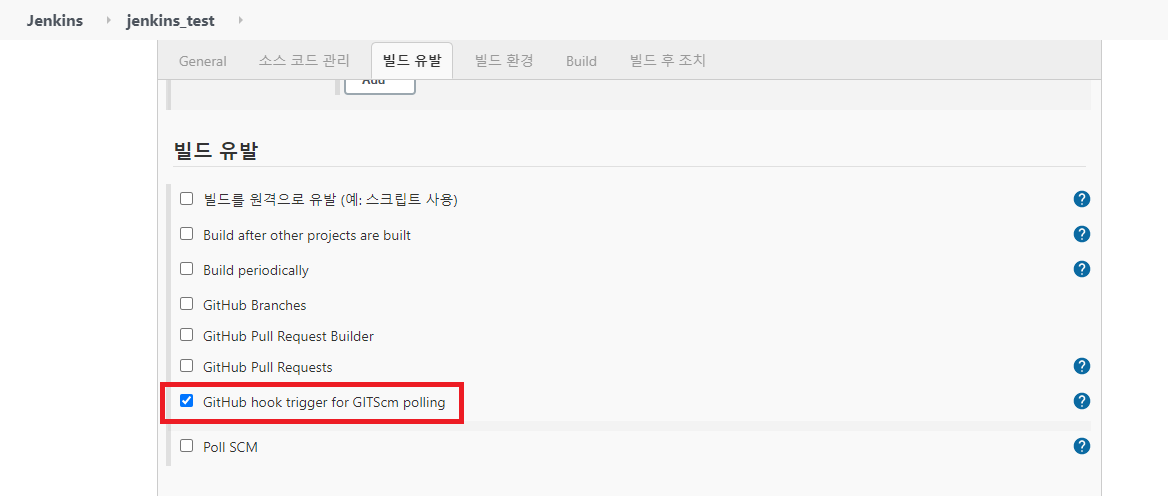 빌드 유발 > GitHub hook trigger for GITScm polling