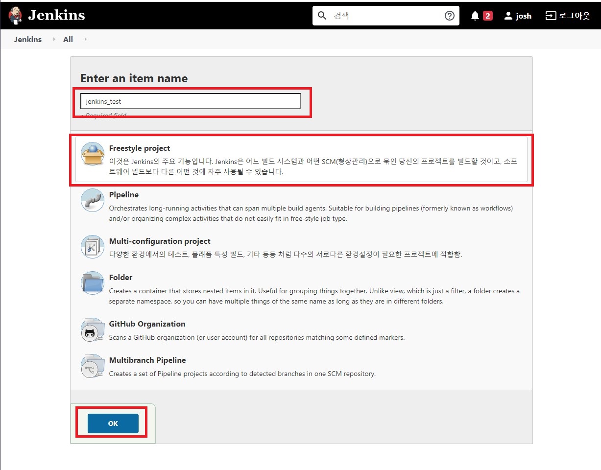> 프로젝트 이름 입력, FreeStyle Project 선택 후 OK