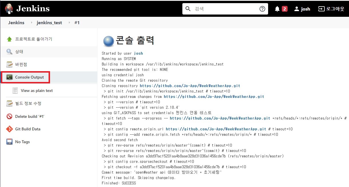 Console Oupput 메뉴를 누르면 빌드 성공/실패 여부를 확인 할 수 있습니다.
