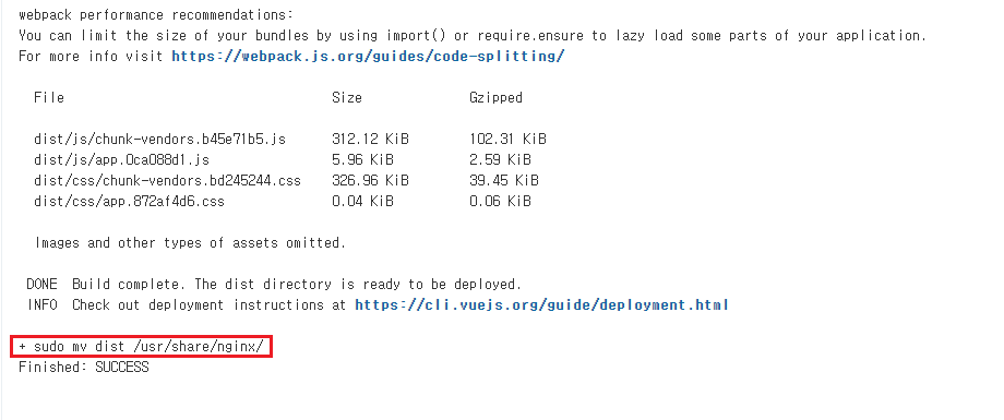 sudo mv dist /usr/share/nginx/ <-- 5. 프론트 소스가 배포되어있는 곳으로 dist 파일을 옮겨줍니다.