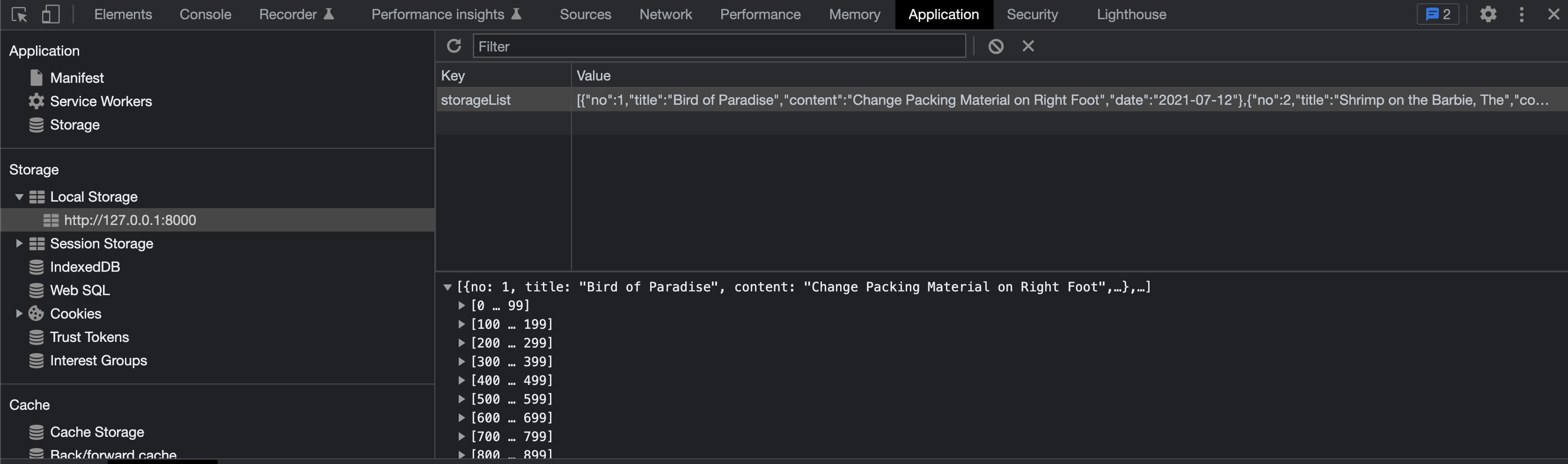 개발자도구 -> Application -> Storage -> Local Storage 에 storageList이름의 키로 데이터가 저장된것을 확인 할 수 있다.