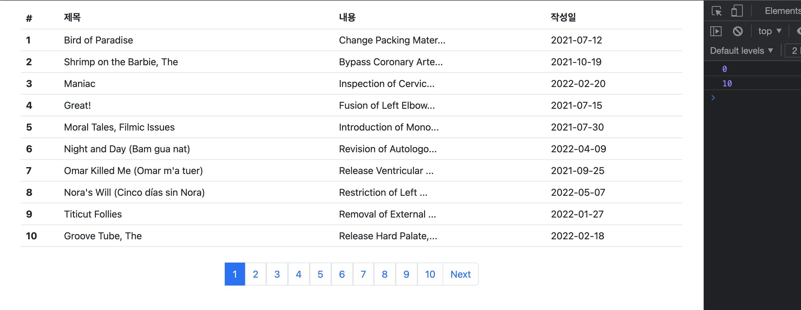 위에서 선언한 _start와 _limit 변수를 가지고와서 해당 페이지에서 보여줄 부분을 10개씩 조회하도록 처리 하였다.
