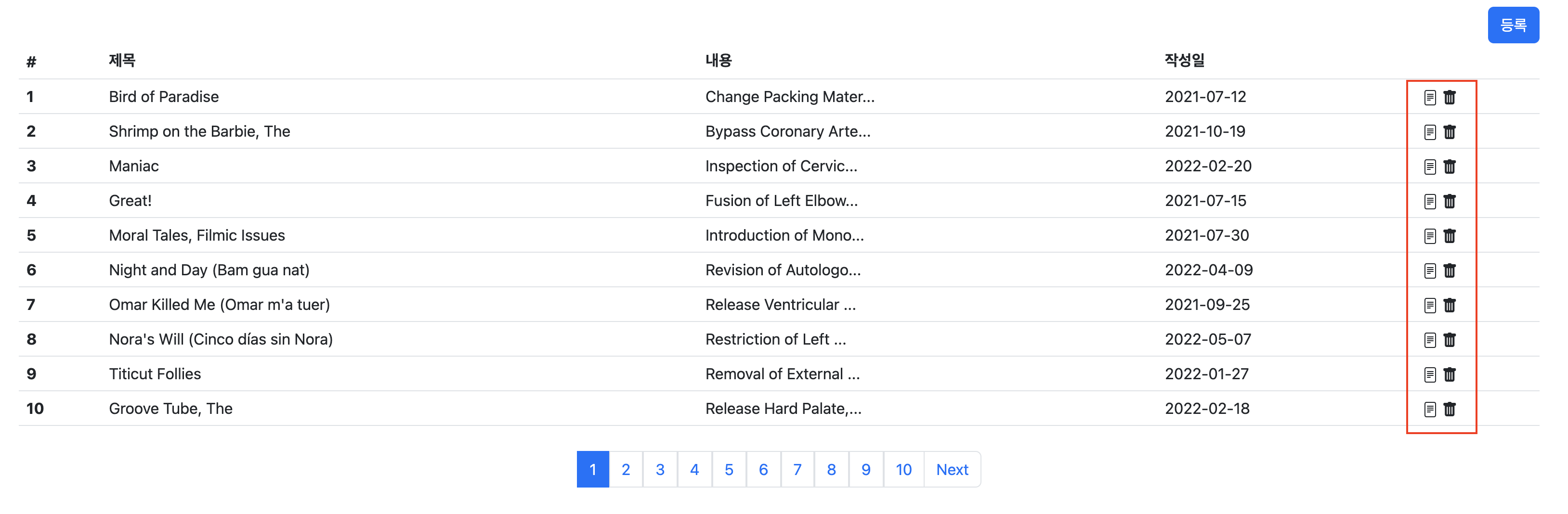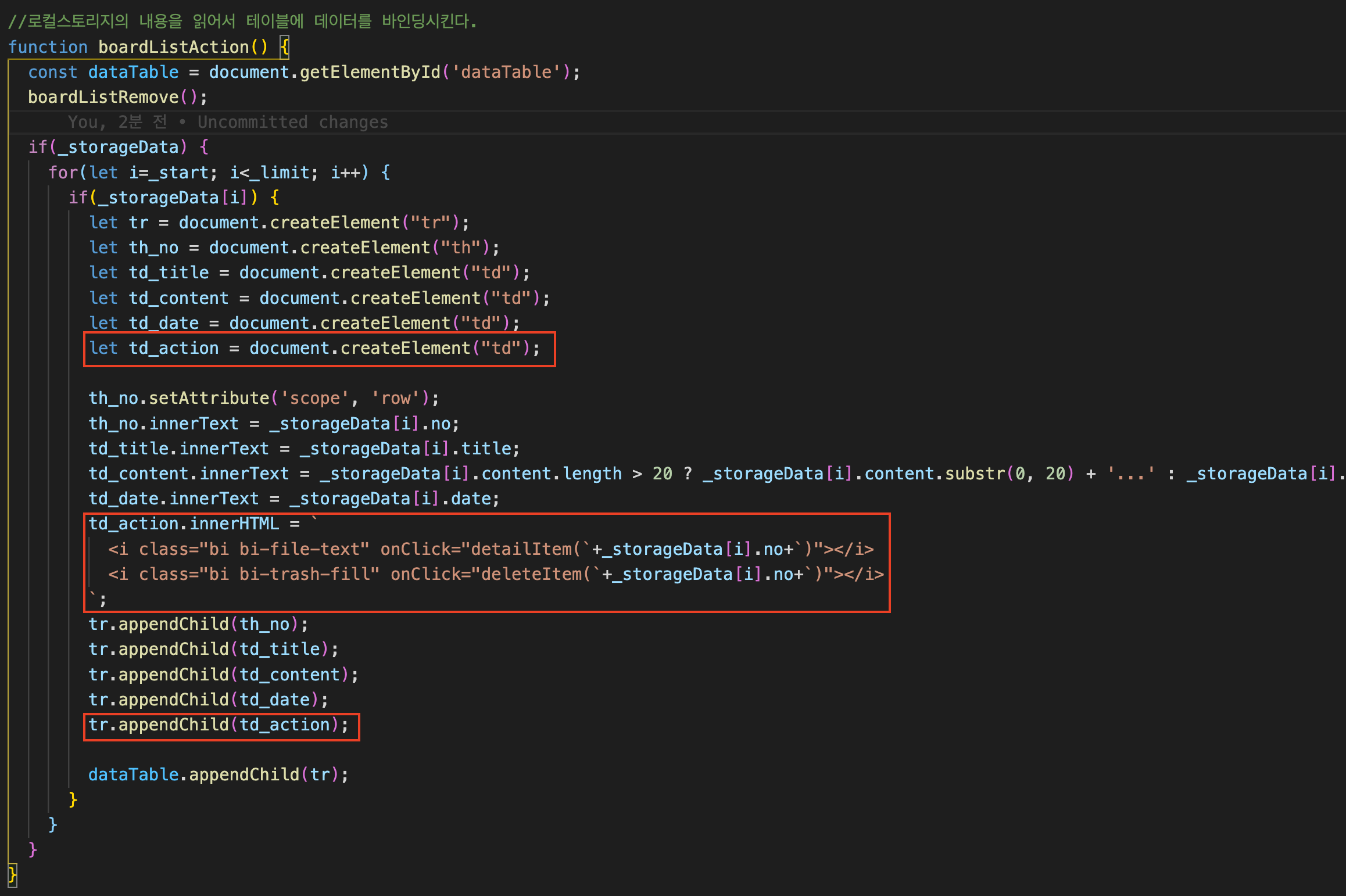상세 페이지 아이콘에 상세페이지 동작(detailItem)함수와, 삭제 아이콘에 삭제 동작(deleteItem)함수를 추가하고, 해당 고유값(data.no)를 넘겨 주었다.