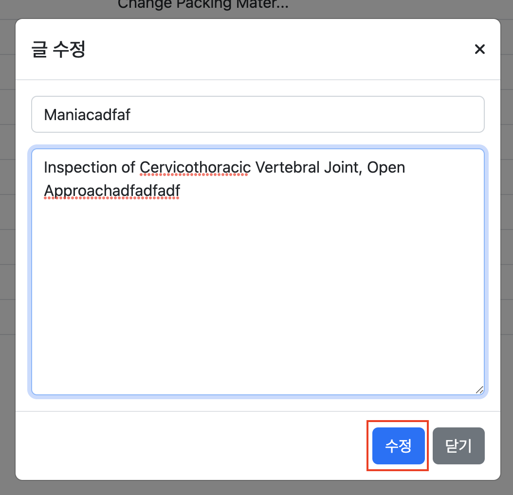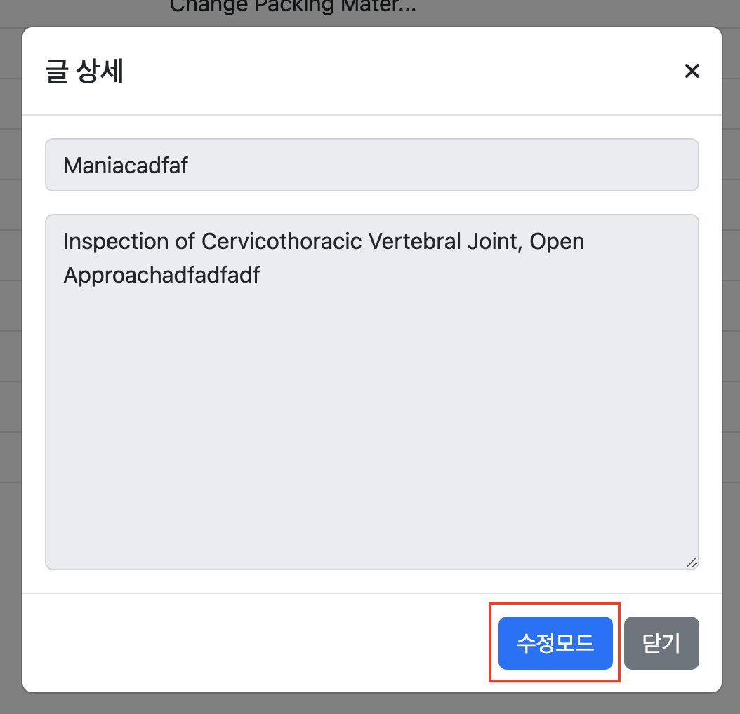 상세보기 모달창에서 수정모드를 누르면 mode가 Edit 으로 변경되며, 게시글을 수정후 저장 하는 이벤트를 사용할 수 있다.